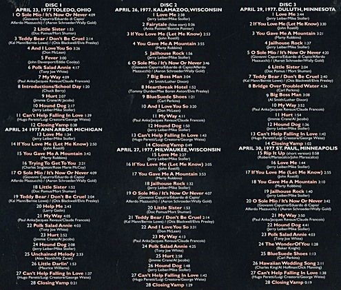 Audio Quality: In 1977 the quality of the soundboards were in general all very good, the mix of instruments, backing-vocals and orchestra is fine, as is the clarity. All six concerts here are a lovely mix, perhaps because Felton Jarvis was there observing his multi-track recordings. The overall sound quality - audio transfers by Vic Anesini / Mastering Jan Eliasson - is improved compared to the previous bootlegs. Sadly, of course, the quality of the soundboards improved over the years while Elvis’ performances got worse!