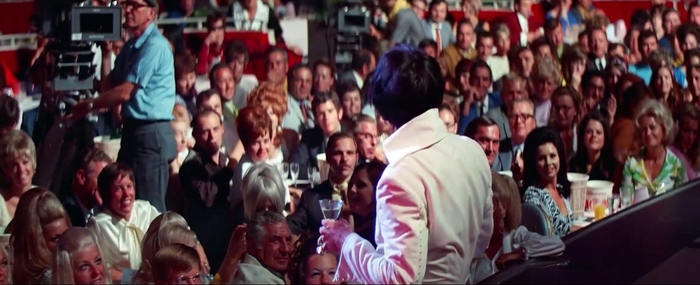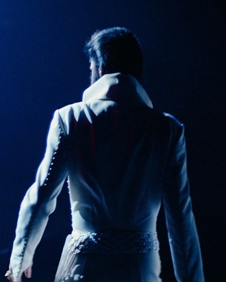 Luhrmann choose to leave in many shots with camera operators seen running around with their 16mm cameras because we live in an era where we're used to seeing cameras everywhere and Luhrmann felt none of the original directors' concern about breaking the illusion. Those extreme close-ups allow us to see even the pores on Presley's skin, now projected onto a screen the size of two buildings. The sweat that comes out of those pores is practically a character in the film. Luhrmann marvels at how much Presley gave in every single rehearsal and every single concert performance. Luhrmann notes, "Elvis must have superhuman strength. He becomes the music. He doesn't mark stuff. He just becomes the music, and then no one knows what he's going to do. The band do not know what he's going to do, so they have to keep their eyes on him all the time. They don't know how many rounds he's going to do in 'Suspicious Minds.' You know, he conducts them with his entire being — and that's what makes him unique."