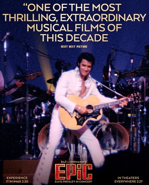 Baz Luhrmann will make you Fall In Love with Elvis Presley: A delightful review from NPR. .. by Tim Greiving it includes... I've never cared a lick about Elvis Presley, who would have turned 91 in January, had he not died in 1977 at the age of 42. Never had an inkling to listen to his music, never seen any of his films, never been interested in researching his life or work. For this millennial, Presley was a fossilized, mummified relic from prehistory — like a woolly mammoth stuck in the La Brea Tar Pits — and I was mostly indifferent about seeing 1970s concert footage when I sat down for an early IMAX screening of EPiC.