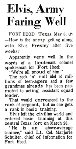 ‘On March 28, Elvis left Fort Chaffee, on his way to Fort Hood, to the Second Armored Division “Hell on Wheels”. At least thirty newsmen awaited the bus when it arrived at Fort Hood 4:34pm on the afternoon. After a press conference and his first meal, he was off-limits to the media. From that point on, Elvis would be “just another soldier,” said an Army spokeswoman.’